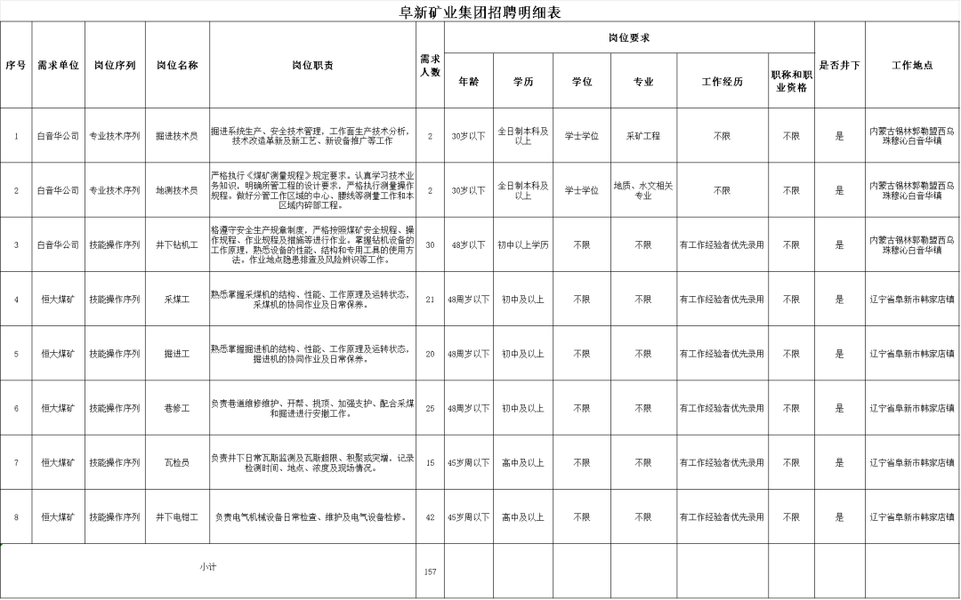 阜新矿业(集团)有限责任公司(以下简称“阜矿集团”)隶属于辽宁省能源产业控股集团有限责任公司,注册资本12.16亿元,现有职工1.1万余人。下辖二级单位17户,其中:生产矿井3座(恒大煤矿、白音华公司露天矿、白音华公司井工矿),核定产能1420万吨/年;非煤单位涵盖机械制造、土建矿建工程、瓦斯利用、测绘勘探、物流运输、新能源开发、绿化复垦、职业教育、生活服务以及井下水资源、煤矸石开发等多方面业务。为满足企业经营发展需要,现面向社会公开招聘并将有关事项公告如下: 招聘岗位及要求 此次计划招聘 157人,具体要求详见《阜新矿业集团招聘明细表》(附件1)。 招聘岗位 报名条件 (一)基本条件 具有中华人民共和国国籍;拥护中国共产党;年满十八周岁;具有良好品行;具有正常履行职责的身体条件和心理素质。 (二)任职条件 1.应聘者应具有岗位要求的学历条件。 2.所学专业符合岗位需求。 3.熟悉本岗位所需的法律法规和专业知识。 4.能够熟练使用办公自动化软件和本专业常用软件。 5.具有良好的职业素养和较好的沟通协调能力。 6.应聘人员不得应聘聘用后即构成回避关系的招聘职位。 7.应聘人员无违法违纪行为和不良记录。 8.符合具体招聘岗位所需要的其他条件。 (三)不得参加招聘情况 有下列情形之一的人员,不得参加此次招聘: 1.受司法机关或纪检、监察机关审查,尚未做出结论的; 2.受党纪、行政处分,尚处影响期内的; 3.有违法犯罪记录的; 4.被依法列为失信被联合惩戒对象的; 5.存在任职回避情形的; 6.法律法规规定的其他影响录用的情形。 应聘程序 (一)报名 本次招聘采用网上及现场报名相结合的方式。每位应聘人员只能应聘一个岗位。 1.网上报名:专业技术岗位报名将材料扫描并整理成压缩文件(注明“应聘单位_姓名_联系电话”)发送至阜矿集团人力资源部邮箱,报名材料包括《阜新矿业集团招聘报名表》(附件2)、身份证、无犯罪(劣迹)记录证明、学信网学历证明(如有)、职业资格证书等材料。 邮箱:fukuangzp@163.com 2.现场报名:技能操作岗位至恒大煤矿人力资源部处报名。报名时请携带身份证、户口本、无犯罪(劣迹)记录证明、学信网学历证明(如有)、职业资格证书等原件及复印件,并现场填报《阜新矿业集团招聘报名表》。 3.报名截止时间:2025年10月24日16时。 (二)资格审核与测试 1.资格审查 阜矿集团人力资源部将对应聘人员年龄、学历、专业等基本情况进行初步筛查,并于30个工作日内通过应聘人员留下的有效联系方式通知审查通过者参加面试、未通过者不再另行通知。 2.测试 考试由阜矿集团人力资源部统一组织。一是对应聘人员进行面试,主要是通过一些精心设计的语言沟通或一些开放式的问题来考察求职者的心理个性特征。二是实操测试(专业技术岗位只进行第一项测试),采用负重60斤1分钟内往返50米。两项合计成绩从高到低的顺序进行录用,考试不及格者原则上不予录用。 (三)考察 由阜矿集团人力资源部会同有关部门对拟聘人选开展考察工作,纪委监察部门全程参与监督。考察人选在阜矿集团及所属单位领导干部有近亲属关系和主要社会关系的,需主动报告。根据招聘岗位的资格条件和要求采取适当方式开展录用前考察工作。 (四)体检 体检将在辽健集团医院进行,不按规定要求进行体检的,视为放弃录用资格。应聘人员在体检过程中如有隐瞒影响录用的疾病或者病史,串通工作人员作弊或者请他人顶替体检以及交换、替换化验样本等行为,一律取消录用资格。体检费用自理。 (五)公示 拟录用人选确定后,在辽宁省国资委网站及阜矿集团微信公众号公示,公示期为5个工作日。 (六)录用 公示结束无异议后,阜矿集团按照《中华人民共和国劳动法》《劳动合同法》等法律规定,与录用人员签订劳动合同。 对录用人员实行试用期制度,试用期按有关规定执行,试用期间发现不符合录用条件的依法解除劳动合同。 其他注意事项 (一)应聘者须如实填报、提供有关信息和材料,凡因本人填写信息错误而导致的一切后果自行承担,如有弄虚作假行为,一经查实即取消应聘资格。 (二)阜矿集团对报名人员提交的材料将严格保密,不作他用,恕不退还。 (三)应届毕业生、退伍军人同等条件下,可优先录用。 (四)招聘公告的解释权归阜矿集团所有。 报名监督电话: 0418-6555266(阜矿集团) 报名咨询电话: 0418-6552039(恒大煤矿) 13464891980 (恒大煤矿) 15042599959 (恒大煤矿) 0479-3836190(白音华公司) 13941863055(白音华公司) 报名咨询时间:工作日(周一至周五) 上午08:30-11:30,下午13:30-16:30 附件1.阜新矿业集团招聘明细表.xls 附件2.阜新矿业集团招聘报名表.xls