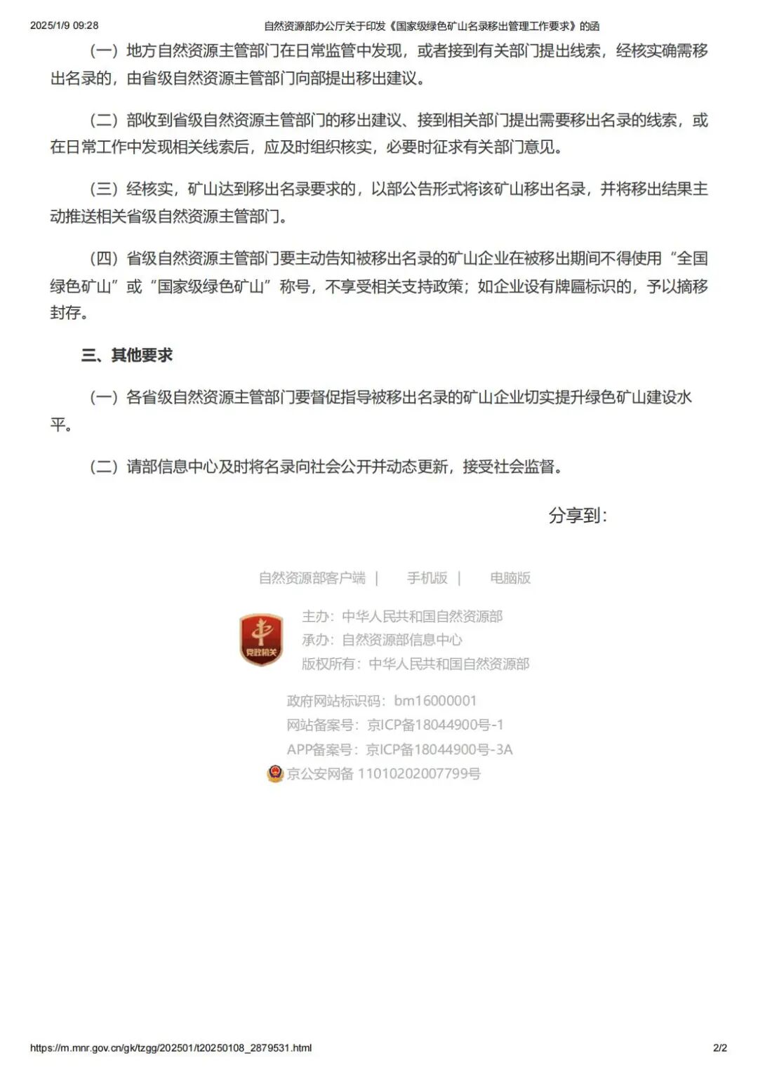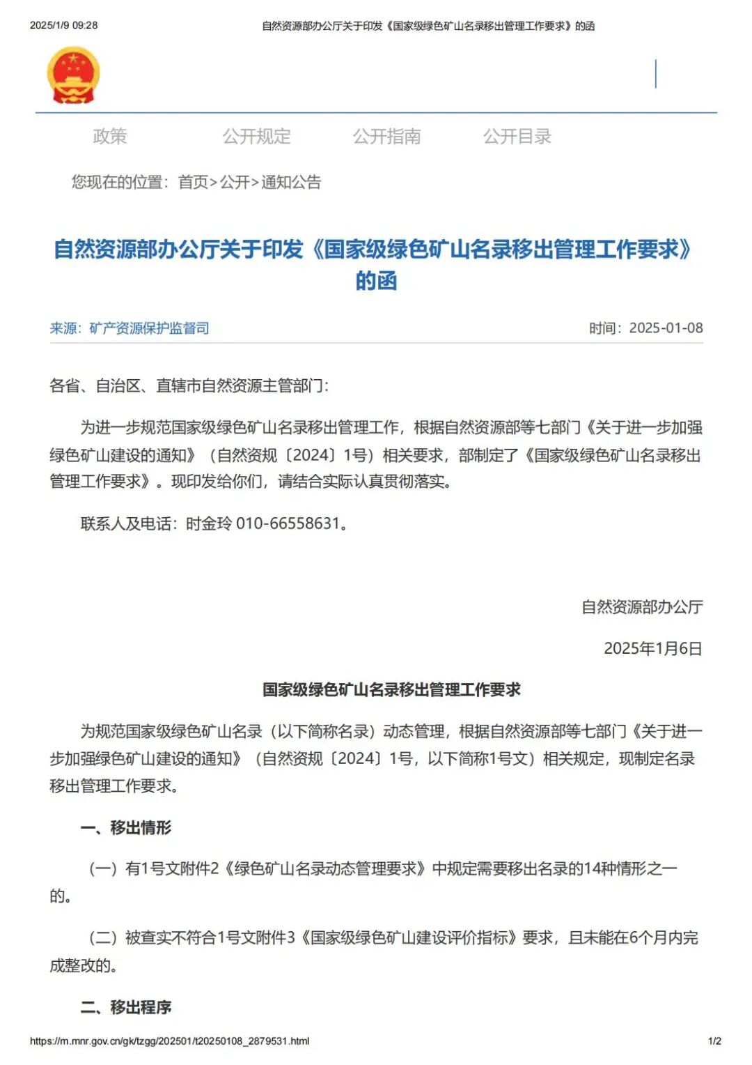 自然资源部办公厅关于印发《国家级绿色矿山名录移出管理工作要求》的函