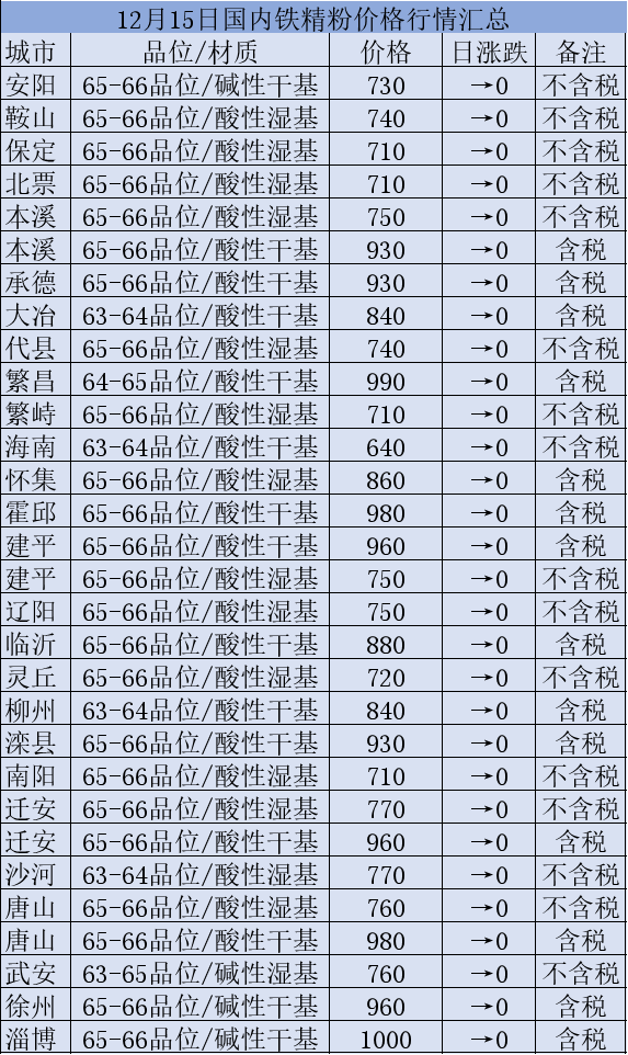 12月15日国内铁精粉行情汇总