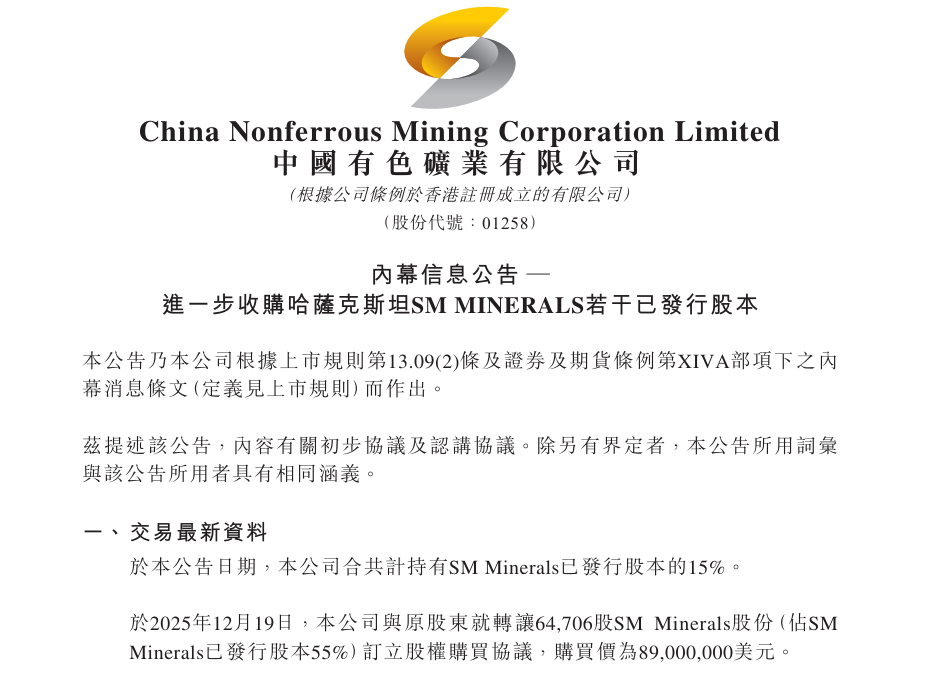 2025年12月19日,中国有色矿业(01258.HK)正式宣布重大收购方案,以8900万美元收购哈萨克斯坦SMMinerals公司55%股权,叠加此前已持有的15%股权,收购完成后合计持股比例将升至70%,成功锁定当地核心矿产项目——本卡拉项目的全部开发权,为公司在中亚区域的资源布局奠定坚实基础