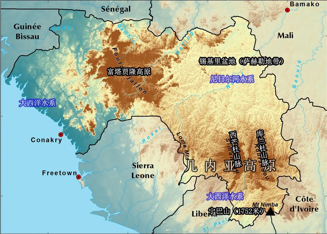 几内亚国土地形主体为西非分水岭向大西洋沿海延伸,其中占据国土大部分地区为富塔贾隆高原及其延伸,多数地区海拔可达1000米以上,最高峰达到1500米,高原内部地形崎岖,峡谷、山峰遍布。富塔贾隆高原是多条西非大河发源地,包括著名的尼日尔河,这处高原也被称为“西非水塔”。