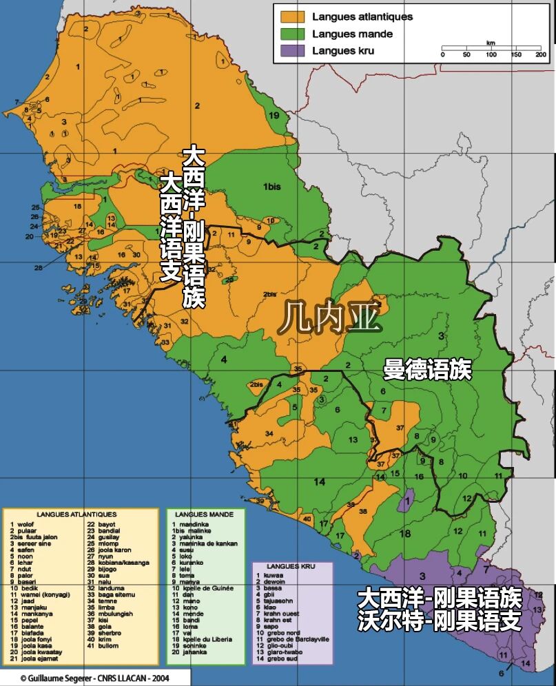 ▲西非沿海地区的语言分布:沿海和内陆大致形成了尼日尔-刚果语系大西洋刚果语族大西洋语支和曼德语族的分化