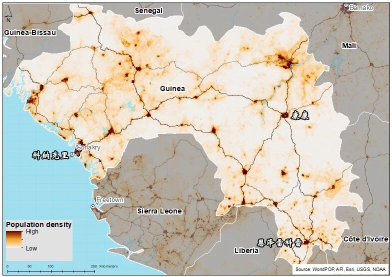 ▲几内亚人口密度:科纳克里、康康、恩泽雷科雷是全国前三大城市,也分别是下几内亚(沿海森林)、上几内亚(萨赫勒草原)、森林几内亚(山地森林)的中心城市
