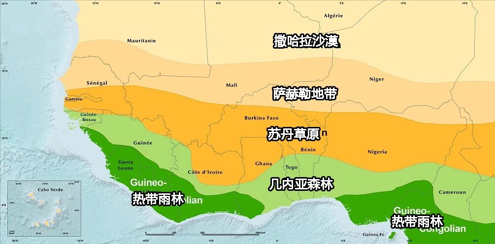 ▲西非地区不同的自然带,其中几内亚横跨草原与森林两大地形带