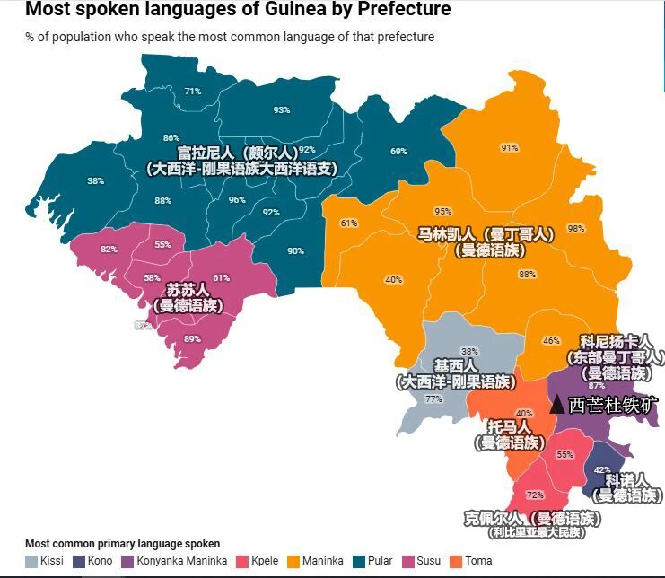 ▲几内亚各地区最多的民族和占比,相比于北部地区,南部森林地带民族众多,许多地区即便是最大民族占比也并不高