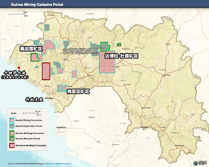 除了铁矿石,几内亚更以铝土矿出名。几内亚铝矾土储量估计约有200亿吨,潜在的储量甚至可能达到400亿吨。目前已探明储量120亿吨。相比之下,中国的铝矾土储量仅有10亿吨,为全球已探明储量的3%,而中国的铝冶炼产能却占到全球的2/3。中国、美国、法国的企业都在几内亚从事铝土开采。几内亚的铝土矿多位于富塔贾隆高原周边,距离海岸线较近,开采和运输难度相较于地处森林地带的西芒杜铁矿要低不少。