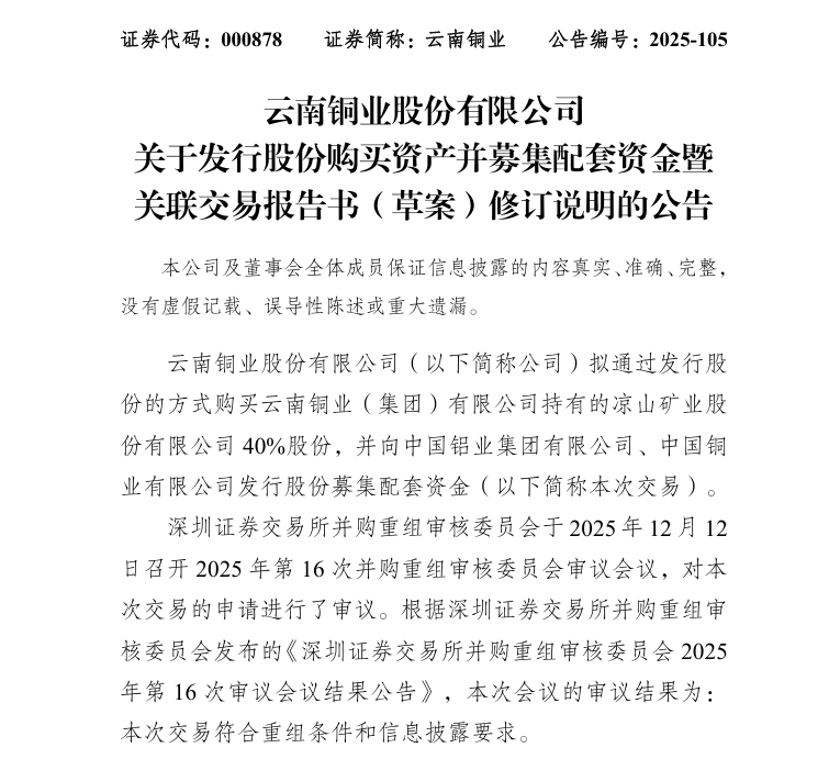 2025年12月23日,云南铜业正式披露,公司发行股份购买凉山矿业40%股权事项获深交所审核通过。