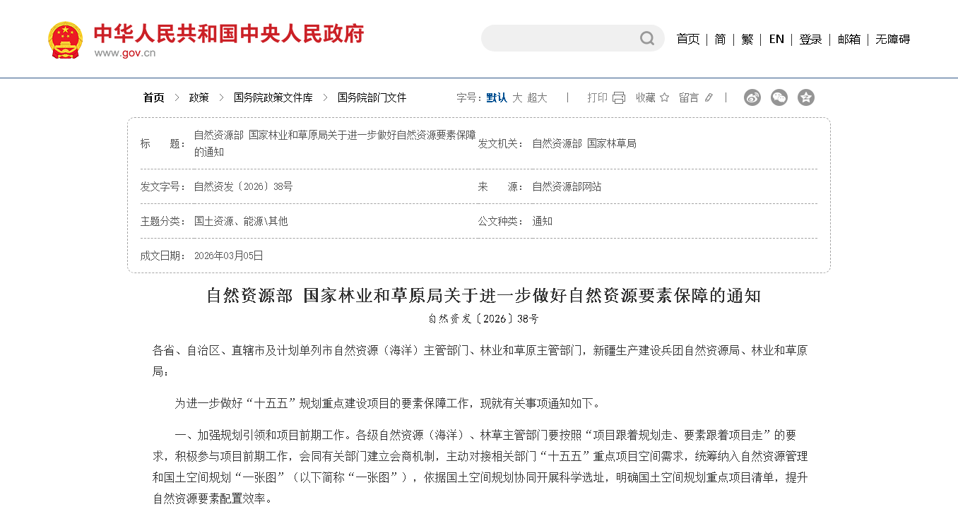 2026 年 3 月 5 日,自然资源部、国家林草局联合印发《关于进一步做好自然资源要素保障的通知》(自然资发〔2026〕38 号),其中第九条专门针对矿业用地作出重大优化,直击行业 “矿合法、地不合法” 的长期痛点,为矿业项目落地、资源保障提供关键政策支撑。