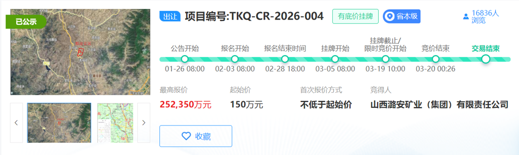 此后不到一天,潞安环能控股股东潞安矿业集团再度出手,以25.24亿元的价格竞得山西省襄垣县王村区块煤炭探矿权。该区块同样毗邻潞安环能总部驻地,勘探面积7.1492平方千米,拟出让年限同为5年,成交价则较150万元的起始价溢价1682倍。 在煤炭行业,资源储备及先进产能被视作企业的核心竞争力。作为行业唯一的国家级高新技术企业,潞安环能拥有煤炭地质总储量98.15亿吨,可采储量56.65亿吨,先进产能达4970万吨/年。同时,公司首创的“潞安烟煤用于高炉喷吹技术”填补了国内空白,是喷吹煤领域龙头企业。 资源储备持续逆势扩容 事实上,自2024年山西重启矿业权市场化出让以来,潞安环能已先后斥巨资斩获多处优质煤炭资源。 2024年8月,潞安环能曾以121.26亿元竞得襄垣县上马区块煤炭探矿权,勘查面积72.42平方千米,煤炭资源量近8200万吨。同年9月,潞安环能与潞安矿业集团正式签署《采矿权转让协议》,以6.95亿元的价格购买其古城煤矿矿区北部约7平方公里的井田采矿权,进一步扩充资源储备。 数据显示,2025年潞安环能原煤产量5606万吨,商品煤销量4956万吨,相较于2024年的5757万吨及5225万吨,分别下降2.62%及5.15%。同时,受煤炭市场整体价格下行及国内商品煤市场供需宽松格局加剧影响,公司2025年净利润预计为10.80亿元至13.20亿元,较上年同期下降50%以上。 尽管产销量与净利润同步下滑,但潞安环能逆势扩张的脚步并未停止。直至此次再斥巨资买矿,公司已累计投入近300亿元扩充资源版图。 近期,多家机构发布研报认为,煤炭行业在经历2025年的业绩低谷后,正迎来多重积极催化,基本面有望在2026年迎来修复与回暖。 从供给端看,受“反内卷、反超产、强安监”政策约束,国内煤炭预计增量有限,行业进入“稳产保供”阶段;从需求端看,虽然动力煤面临传统淡季,但化工耗煤需求有望持续释放,成为推动煤价反弹的重要力量。 机构预计,随着煤价上行,2026年煤炭企业业绩将会有所改善。 (来源:上海证券报)