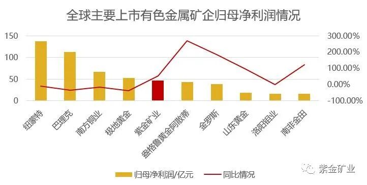 在此背景下,紫金矿业坚持“金铜矿产为主与其他金属矿产业相结合”的战略优势,金铜等“拳头产品”量价齐升,业绩大幅增长,增长幅度超过50%。其中,归母净利润位居已发布业绩的全球主要上市有色矿企第5位、全球主要上市黄金矿企第4位;值得注意的是,紫金矿业前三季度归母净利润已超2019全年。