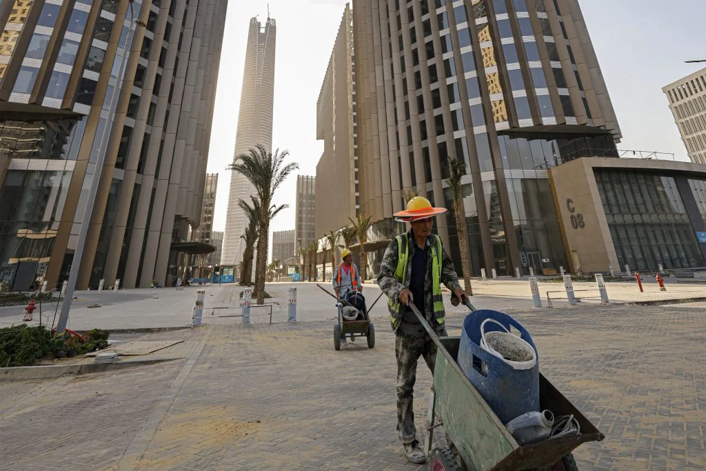 建筑工人在新行政首都项目的核心商务金融区推着手推车作业(图源:AFP)