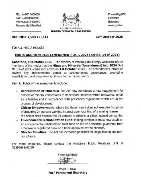 2025年10月1日,一项重磅法案《矿山和矿产法(2024年修正案)》(以下简称“新矿法”)颁布了。在以前的文章中曾用“资源民族主义者”来形容非洲国家“资源本土化”政策,这次修正案等同于博茨瓦纳向全球宣告:矿产资源将由本土掌控。