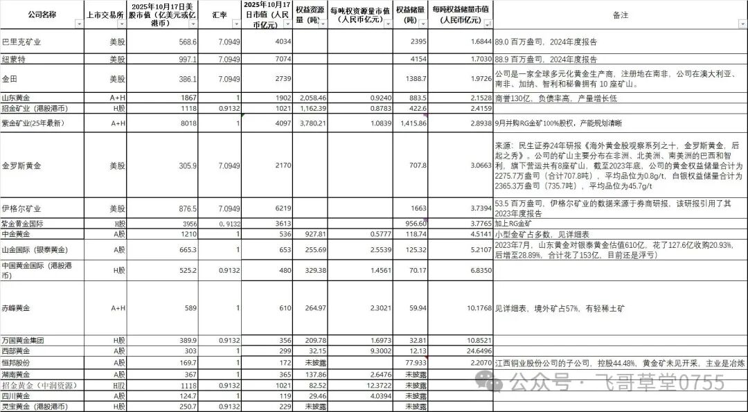 说明:紫金矿业是综合性矿业公司,铜、黄金、白银、碳酸锂、钼等多金属。紫金矿业黄金业务的市值按照2025年1到3季度各业务毛利润占总到毛利润到比例,乘以用市值估算。估算黄金业务比例时,比例提升5%,避免低估黄金业务市值。