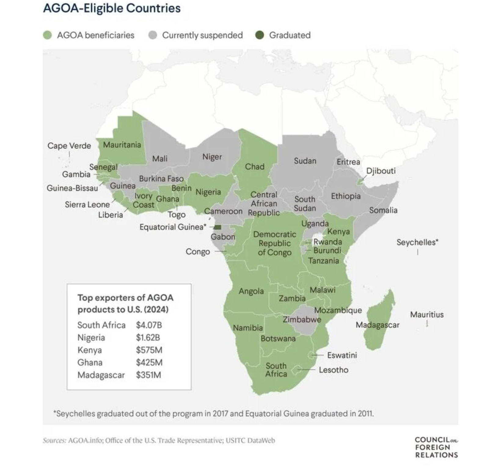 导读 2025年10月1日,美国外交关系协会(CFR)网站刊发了一篇题为“《非洲增长与机遇法案(AGOA):美国对非贸易计划》的报告,对AGOA的创立、内容、成效、挑战以及未来走向作了比较全面的梳理和分析。 报告指出,AGOA是美国于2000年启动的一项单边优惠贸易计划,旨在通过为撒哈拉以南非洲国家提供对美国市场的免税出口待遇,促进该地区的经济增长与民主发展。该计划涵盖32个符合条件的国家,允许数千种产品零关税进入美国市场,尤其在服装、汽车等领域取得显著成效,并一度推动非洲对美出口大幅增长。报告认为,目前AGOA面临诸多挑战:出口过度依赖少数国家和能源产品,整体利用率偏低;许多国家因行政障碍、基础设施不足和意识缺乏而未能充分利用其优惠;美国国内对该计划的热情有所减退,且尚未与任何非洲国家达成更深入的自由贸易协定。与此同时,中国、欧盟等在非洲的贸易与投资影响力不断扩大,使AGOA的未来更具不确定性。 报告提出,该计划已于2025年9月到期,其是否续期、如何改革,成为美非经济关系的关键议题。现予编译,供读者参考辨析,文章观点不代表本公众号和编译者立场。