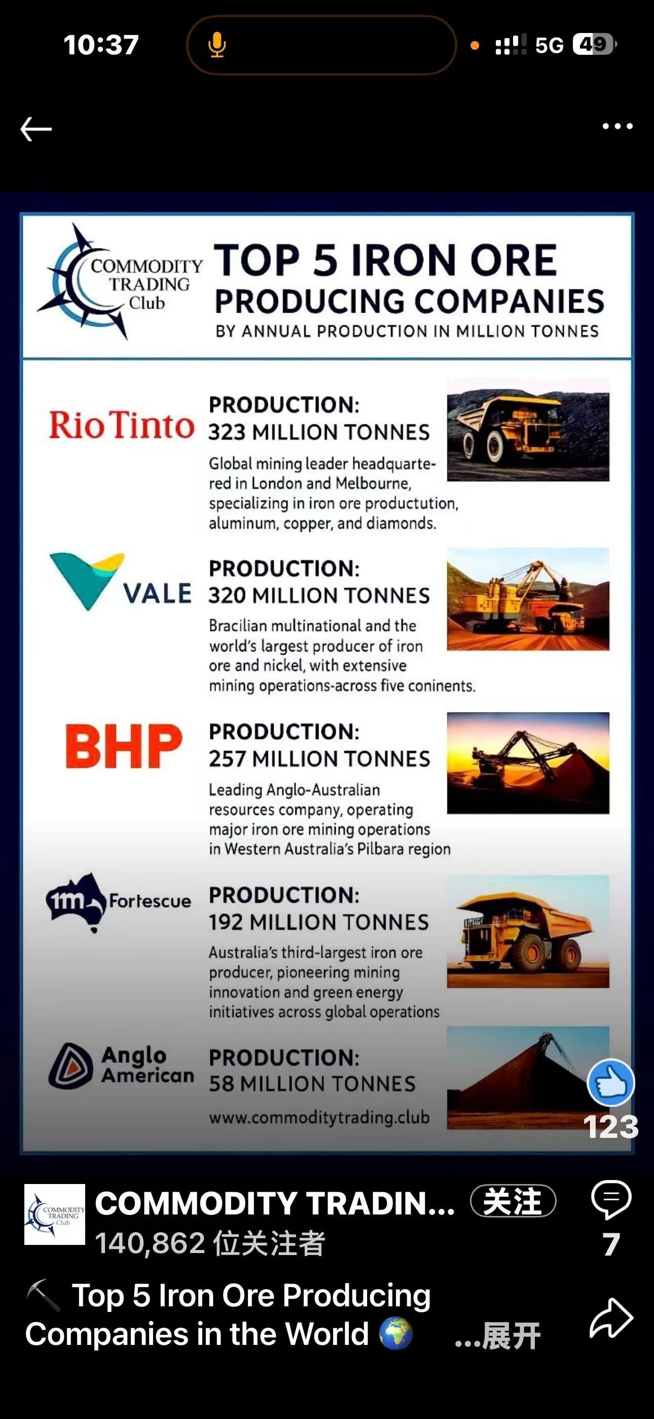 1) 力拓 (Rio Tinto):3.23亿吨,总部位于伦敦和墨尔本的全球矿业巨头。