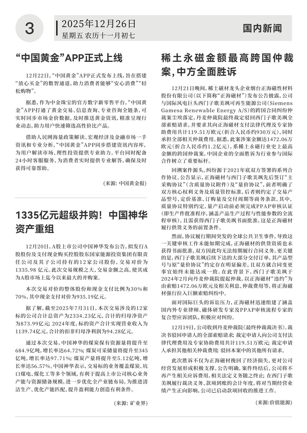 12月21日晚间,稀土磁材龙头企业烟台正海磁性材料股份有限公司发布公告披露,公司与国际风电巨头西门子歌美飒可再生能源公司的跨国合同纠纷仲裁案尘埃落定,丹麦仲裁院最终裁定驳回西门子歌美飒全部索赔请求,并要求其向正海磁材支付法律代理及专家协助费用共计119.51万欧元,同时承担全部相关仲裁费用。据悉,此案涉案金额达1472.06万欧元,系稀土永磁行业史上最高金额的跨国仲裁案。