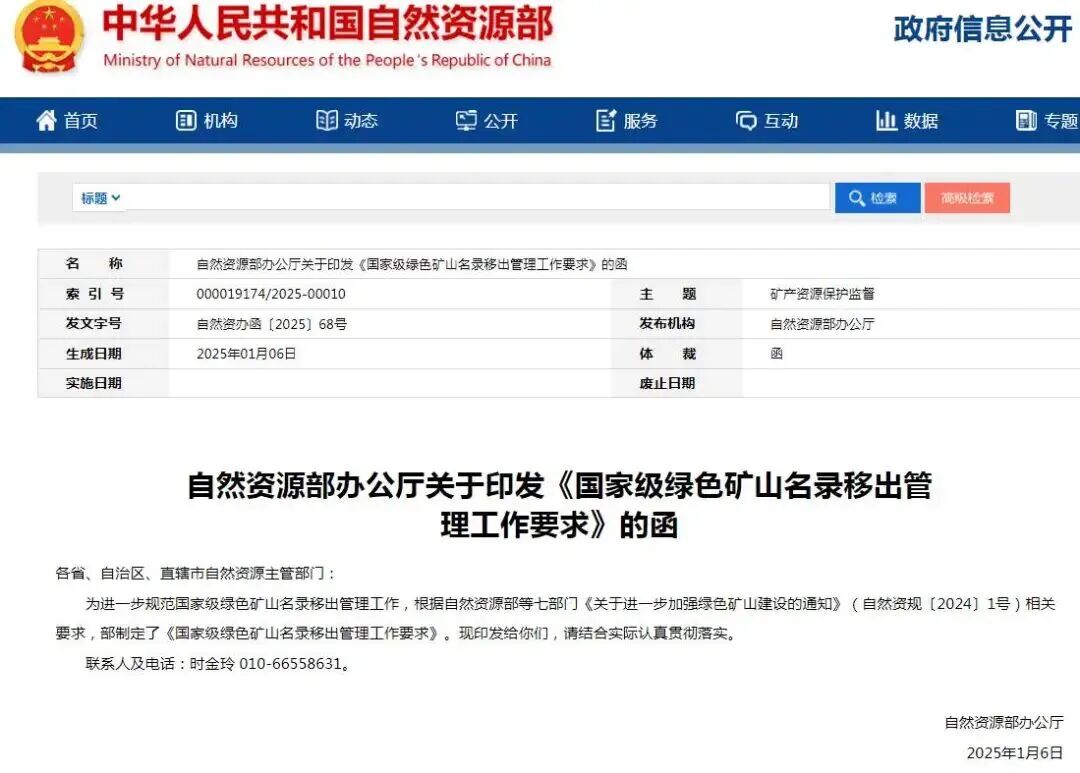 1月,自然资源部办公厅印发《国家级绿色矿山名录移出管理工作要求》,从移出情形、移出程序等方面,明确国家级绿色矿山名录移出管理工作要求,以规范国家级绿色矿山名录动态管理。2024年4月,自然资源部、生态环境部、财政部等七部门印发《关于进一步加强绿色矿山建设的通知》,提出进一步完善标准体系,强化监督考核,严格绿色矿山名录动态管理,并以附件形式发布《绿色矿山名录动态管理要求》《国家级绿色矿山建设评价指标》等。此次文件明确提出各省级自然资源主管部门要督促指导被移出名录的矿山企业切实提升绿色矿山建设水平,国家级绿色矿山名录向社会公开并动态更新,接受社会监督。