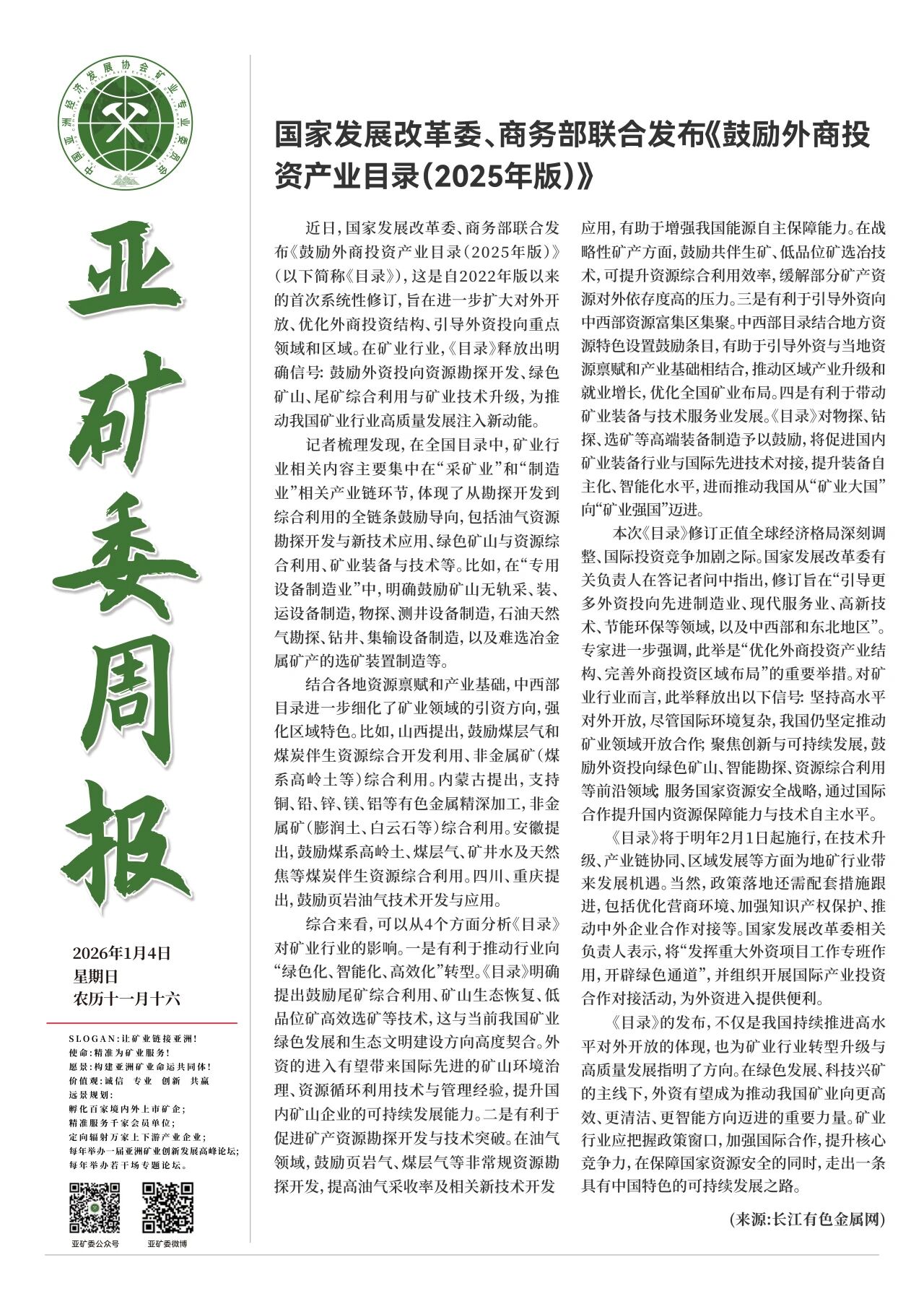 近日,国家发展改革委、商务部联合发布《鼓励外商投资产业目录(2025年版)》。在矿业行业,《目录》释放出明确信号:鼓励外资投向资源勘探开发、绿色矿山、尾矿综合利用与矿业技术升级,为推动我国矿业行业高质量发展注入新动能。《目录》将于明年2月1日起施行,在技术升级、产业链协同、区域发展等方面为地矿行业带来发展机遇。