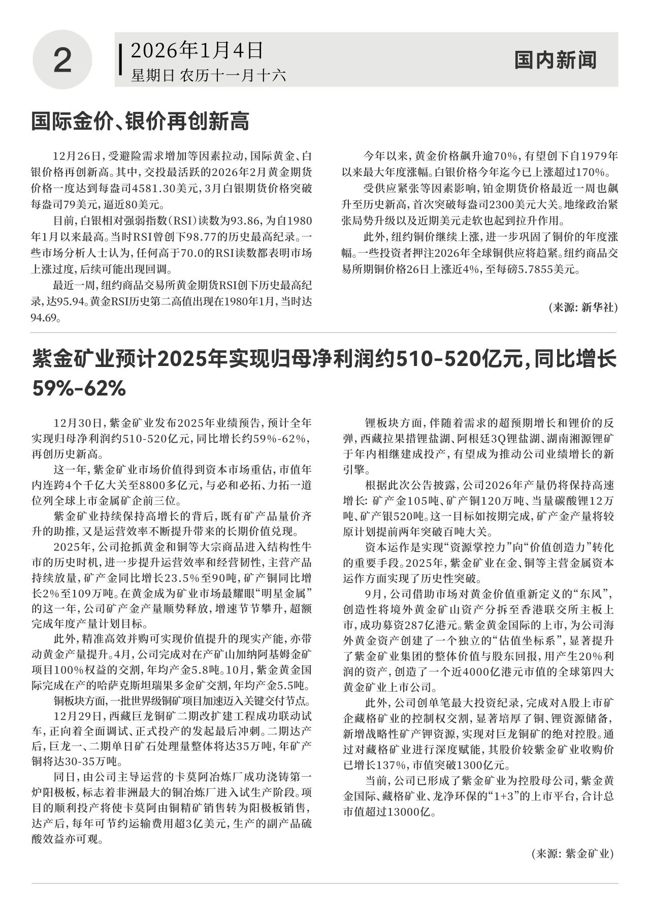 12月31日,紫金矿业2025年第二次临时股东会完成了董事会换届,第九届董事会举行第一次会议选举产生了董事会领导班子,聘任了新一届经营班子,邹来昌当选第九届董事会董事长,林泓富任公司总裁。为表彰公司创始人陈景河先生对公司发展作出的重大贡献,公司聘任陈景河先生为终身荣誉董事长、高级顾问,并将此安排写入《公司章程》。