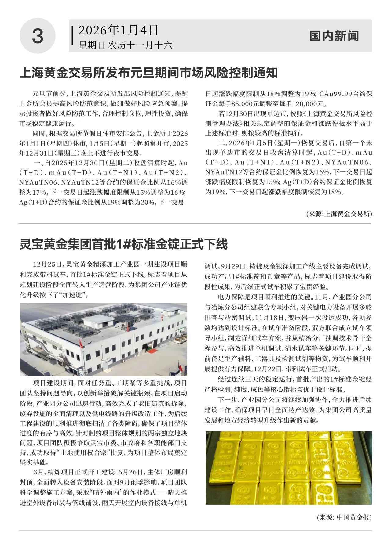 元旦节前夕,上海黄金交易所发出风险控制通知,提醒上金所会员提高风险防范意识,做细做好风险应急预案。提示投资者做好风险防范工作,合理控制仓位,理性投资,确保市场稳定健康运行。同时,根据交易所节假日休市安排公告,上金所于2026年1月1日(星期四)休市,1月5日(星期一)起照常开市,2025年12月31日(星期三)晚上不进行夜市交易。