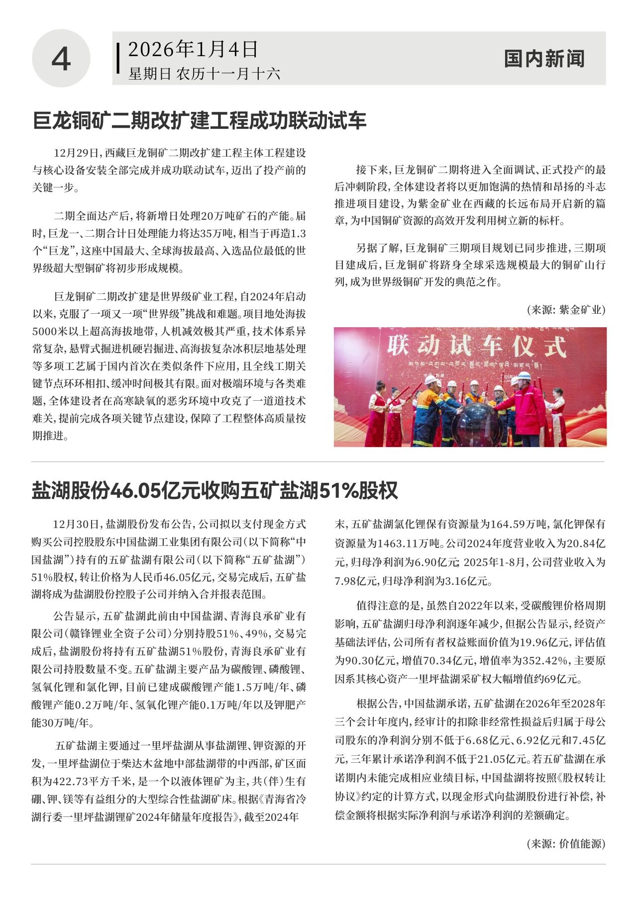 12月29日,西藏巨龙铜矿二期改扩建工程主体工程建设与核心设备安装全部完成并成功联动试车,迈出了投产前的关键一步。二期全面达产后,将新增日处理20万吨矿石的产能,这座中国最大、全球海拔最高、入选品位最低的世界级超大型铜矿将初步形成规模。另据了解,巨龙铜矿三期项目规划已同步推进,三期项目建成后,巨龙铜矿将跻身全球采选规模最大的铜矿山行列,成为世界级铜矿开发的典范之作。