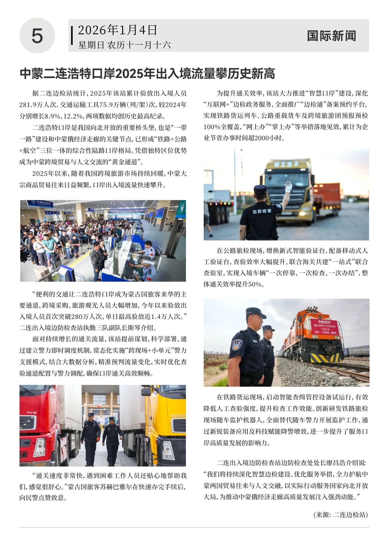 据二连边检站统计,2025年该站累计验放出入境人员281.9万人次,交通运输工具75.9万辆(列/架)次,较2024年分别增长8.9%、12.2%,两项数据均创历史最高纪录。