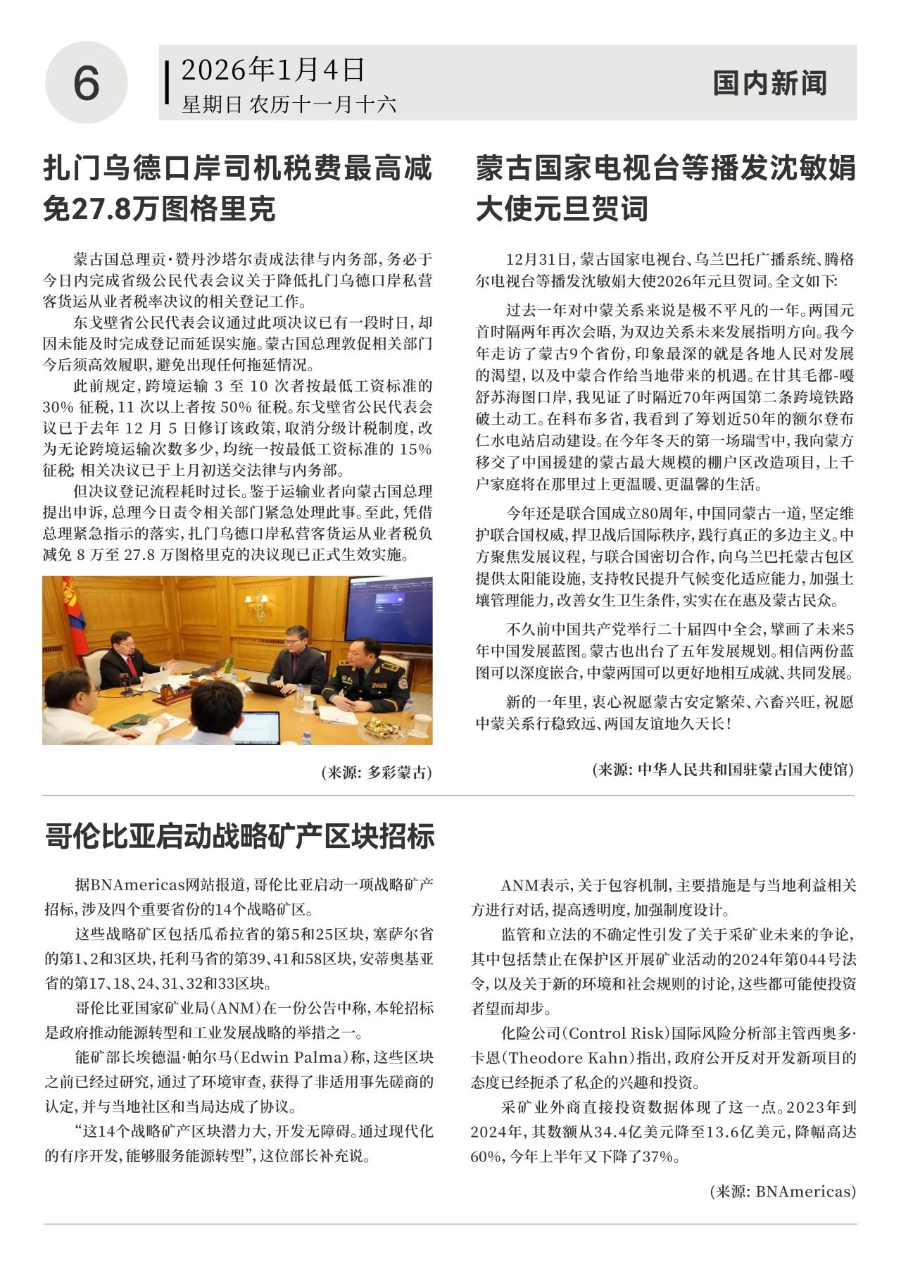 1月3日,蒙古国总理贡・赞丹沙塔尔责成法律与内务部,务必于今日内完成省级公民代表会议关于降低扎门乌德口岸私营客货运从业者税率决议的相关登记工作。凭借总理紧急指示的落实,扎门乌德口岸私营客货运从业者税负减免 8 万至 27.8 万图格里克的决议现已正式生效实施。