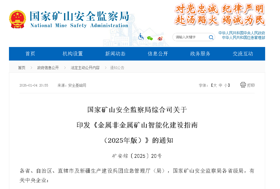 2025 年 12 月,国家矿山安全监察局正式发布该指南,作为我国金属非金属矿山领域首份系统性智能化顶层设计文件,它以 “减人、增安、提效” 为核心,终结了行业智能化建设 “单点突破、各自为战” 的困境,为矿山从 “传统粗放” 向 “数据驱动” 转型划定了清晰路径。