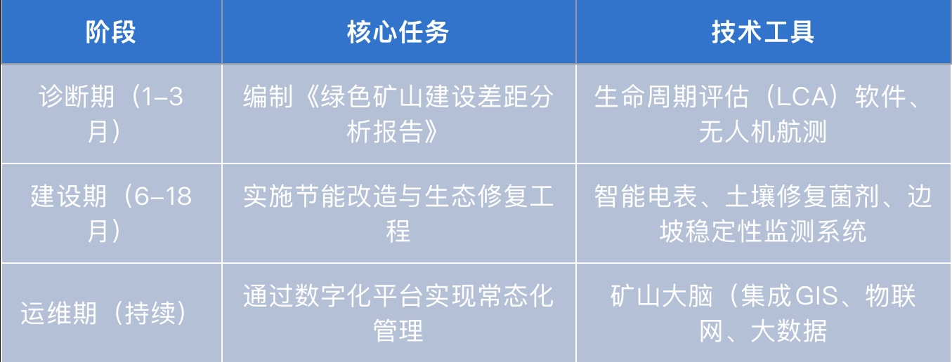 2.国际经验 智利Escondida铜矿: 通过海水淡化与闭环水系统实现淡水零消耗; 设立生物多样性保护区,复育本地特有物种美洲驼。 六、未来趋势与应对建议 1.技术迭代方向 • 碳捕集与封存(CCUS) :试点将CO₂注入采空区驱替煤层气,兼具减排与增产效应。 • 数字孪生矿山:构建虚拟矿山模型,实时优化开采方案与生态修复策略。 2.企业行动指南 • 战略层面:将绿色矿山建设纳入ESG报告核心指标,吸引绿色金融支持(如发行碳中和债券); • 执行层面:设立专职绿色矿山办公室,统筹技术、法务、财务部门协同推进。