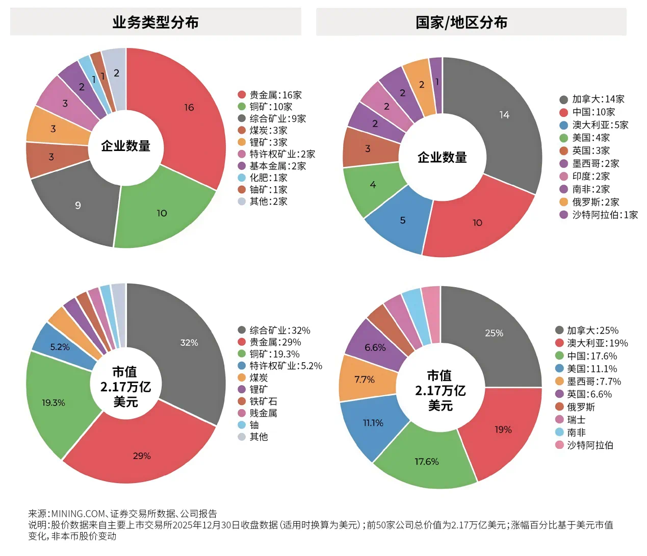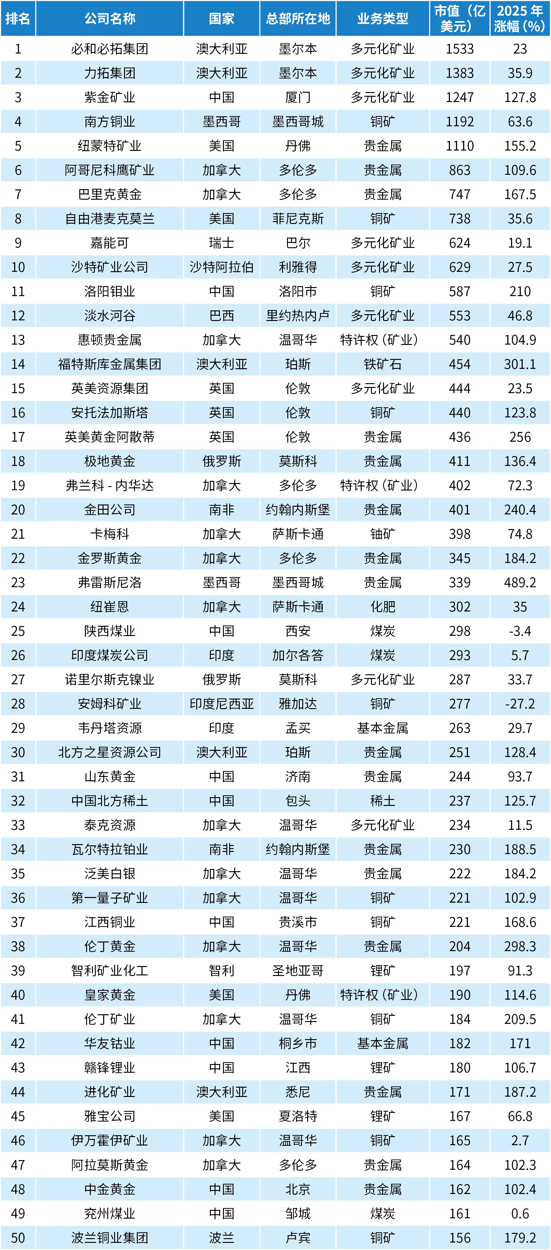 在前50大矿商市值飙升70%的过程中,大部分功劳应归于贵金属价格的狂涨以及铜价的上涨,但涨幅分布广泛,就连传统经济中的铁矿石以及备受诟病的锂矿也加入了上涨行列,尽管它们起步较晚。表现最佳的榜单上闪耀着众多金银类股,其中伦敦上市的墨西哥佩诺莱斯集团旗下的银矿商弗雷斯尼洛公司的股价更是飙升了5倍。该公司多年来在榜单上的排名一直起伏不定,如今已稳居中游。今年上榜竞争激烈,科厄尔矿业公司的遭遇就是明证。该公司在9月底首次跻身前50名,但第四季度表现平平,尽管其市值在2025年全年增长了两倍多,最终还是跌出了榜单。除了各种贵贱不一的矿产,稀土是2025年最引人注目的故事。珀斯的莱纳斯稀土公司在第三季度末挤进第49位,与拉斯维加斯的MP材料公司一同上榜,后者在上半年因与五角大楼达成一项开创性协议而排名飙升。MP材料公司今年的涨幅仍超过200%,莱纳斯公司股价也翻了一番,但这仍不够,如今这两家公司再次跌出排名,只有中国北方稀土公司多年来一直代表这17种元素。取代稀土股的是全球两大锂生产商。由于供应过剩状况在第二季度开始缓解,电池金属锂的价格上涨,智利矿业化工和美国生产商雅宝得以重回前50名,使得锂矿商的数量重新达到3家。该行业在2022年达到顶峰,当时有6只股票上榜,目前排在第58位的天齐锂业如果锂价持续上涨,或许能赶上其中国同行赣锋锂业,但像澳大利亚的矿业资源公司和皮尔巴拉矿业公司(现为PLS集团)这样的生产商可能就没那么容易了。