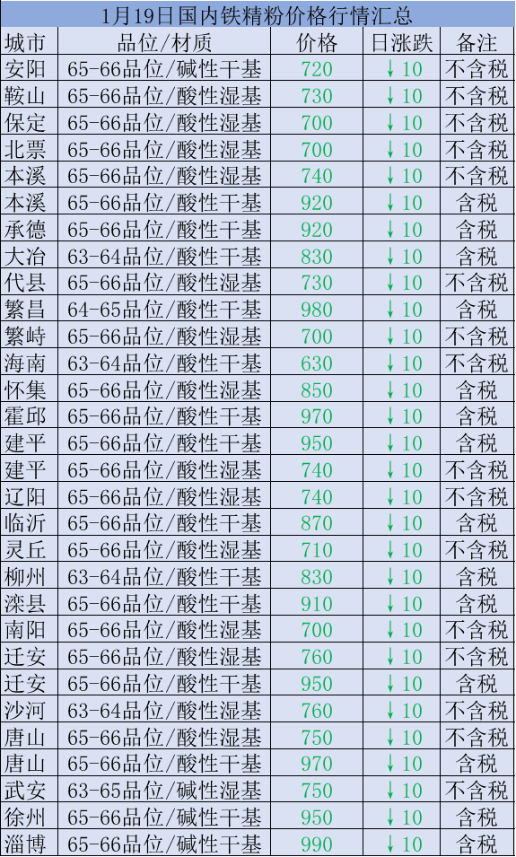 1月19日国内铁精粉行情汇总