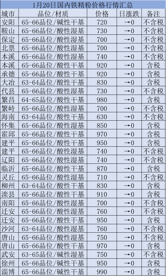1月20日国内铁精粉行情汇总