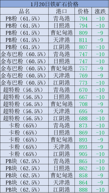 1月20日矿石价格汇总