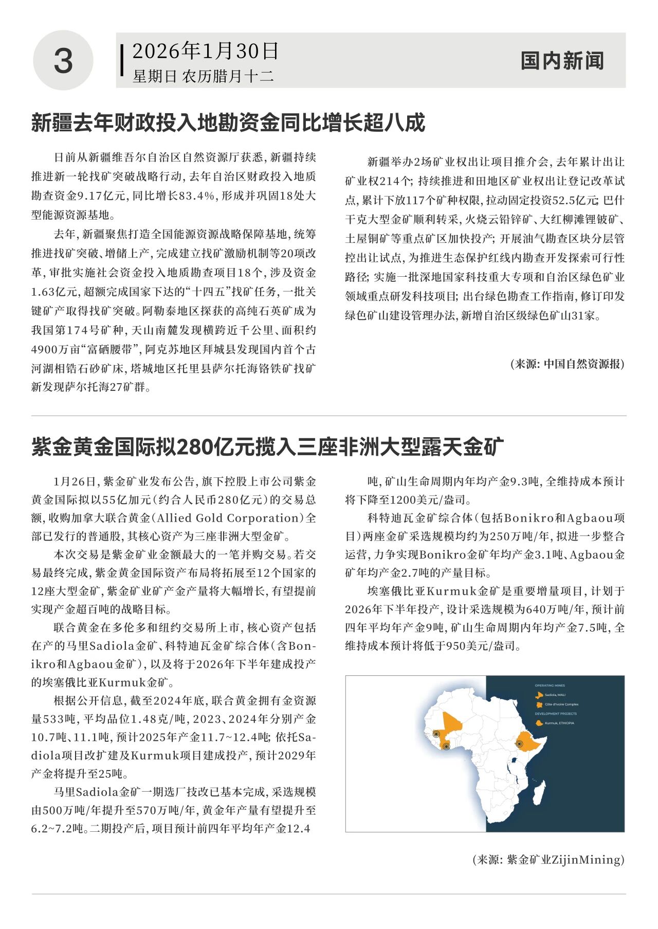 1月26日,紫金矿业发布公告,旗下控股上市公司紫金黄金国际拟以55亿加元(约合人民币280亿元)的交易总额,收购加拿大联合黄金(Allied Gold Corporation)全部已发行的普通股,其核心资产为三座非洲大型金矿。若交易最终完成,紫金黄金国际资产布局将拓展至12个国家的12座大型金矿,紫金矿业矿产金产量将大幅增长,有望提前实现产金超百吨的战略目标。