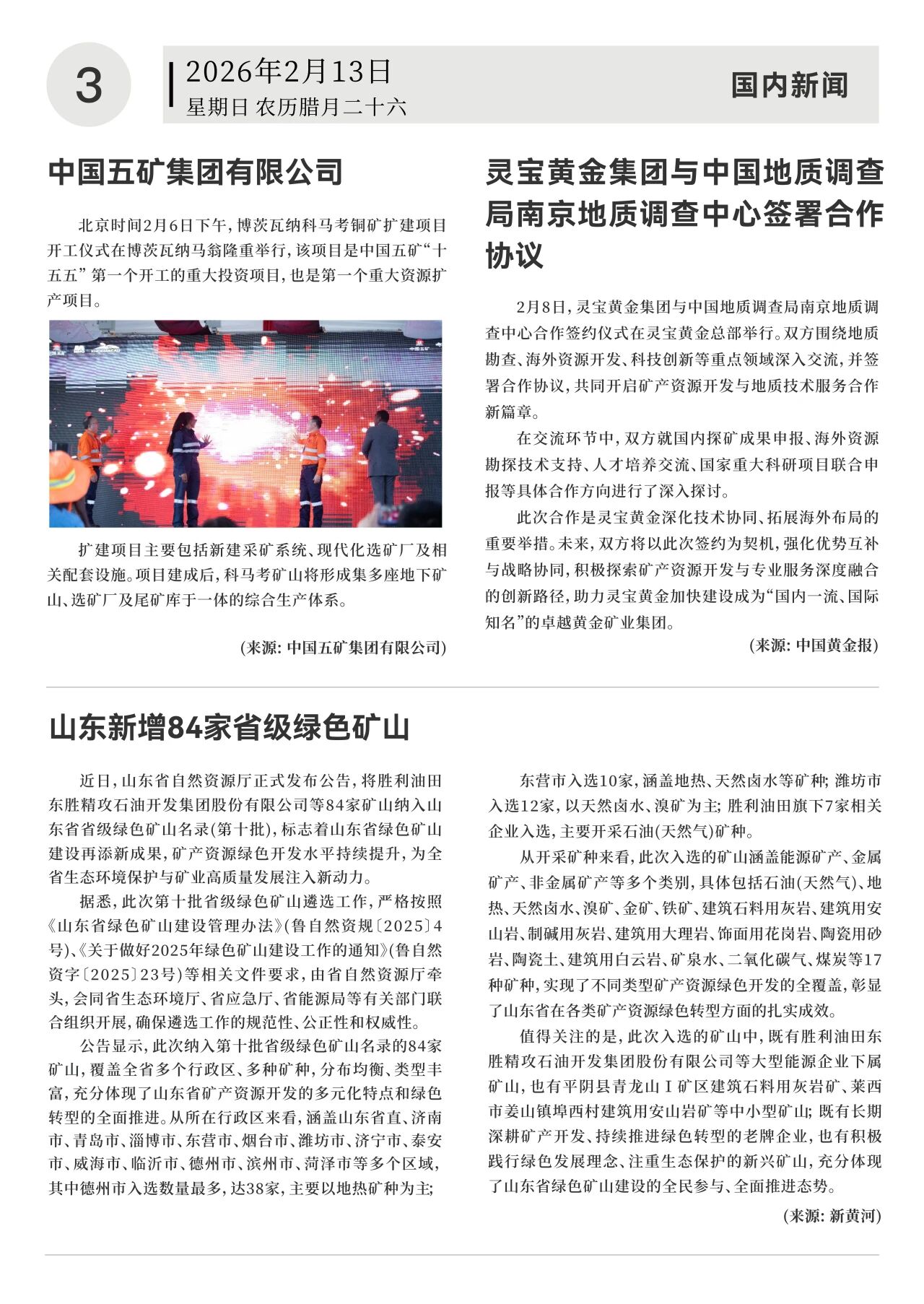 2月10日,中国有色矿业集团有限公司(以下简称“中国有色集团”)与中国黄金集团有限公司(以下简称“中国黄金集团”)签署全面深化战略合作框架协议。在地质勘查与矿产资源开发领域,双方将围绕国内外重点成矿区带及“一带一路”沿线,开展探矿找矿、资源投资开发等合作,共同拓展海外矿产资源市场。