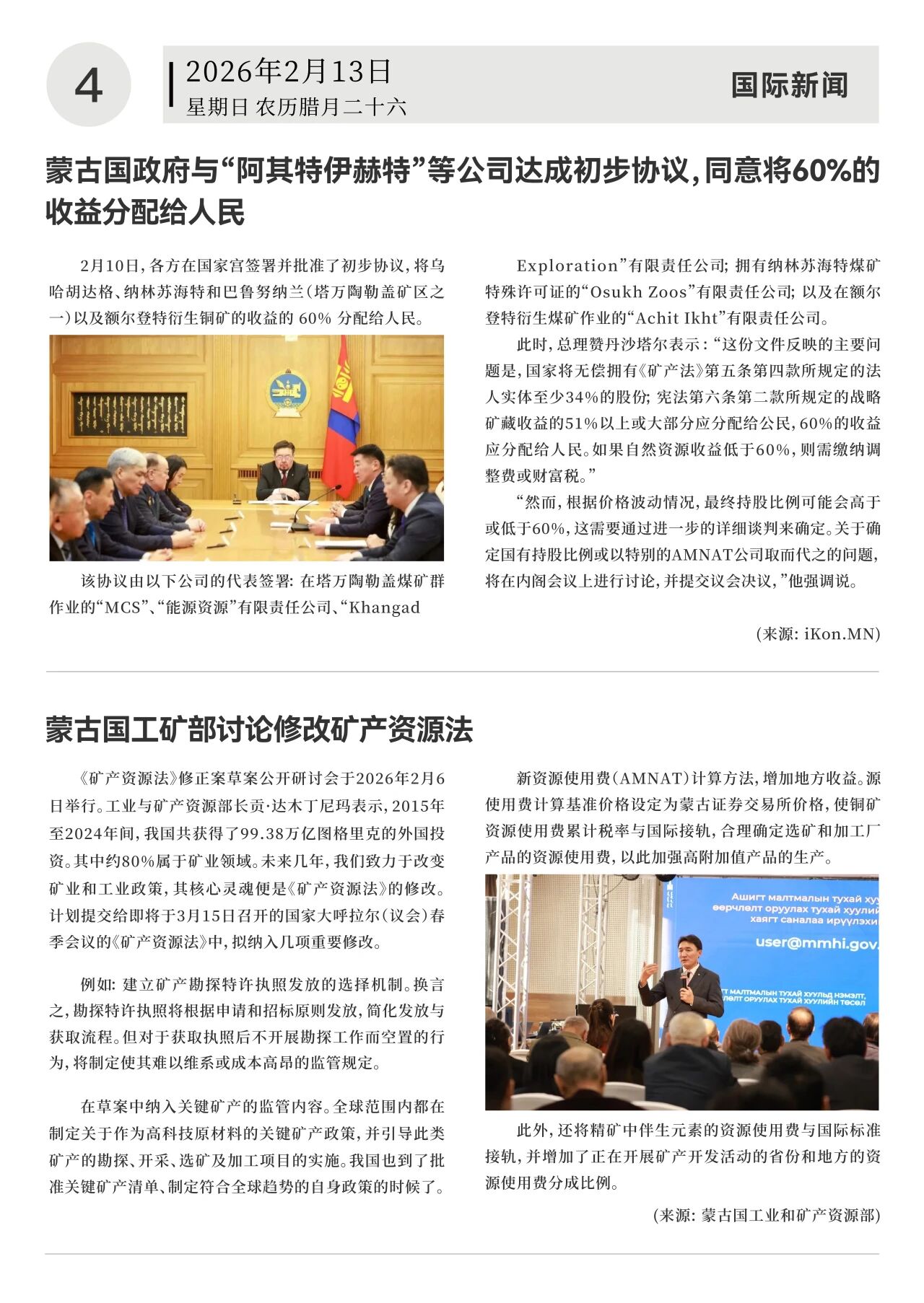 (来源:中国有色金属报) 国际新闻 蒙古国政府与“阿其特伊赫特”等公司 达成初步协议同意将60%的收益分配给人民