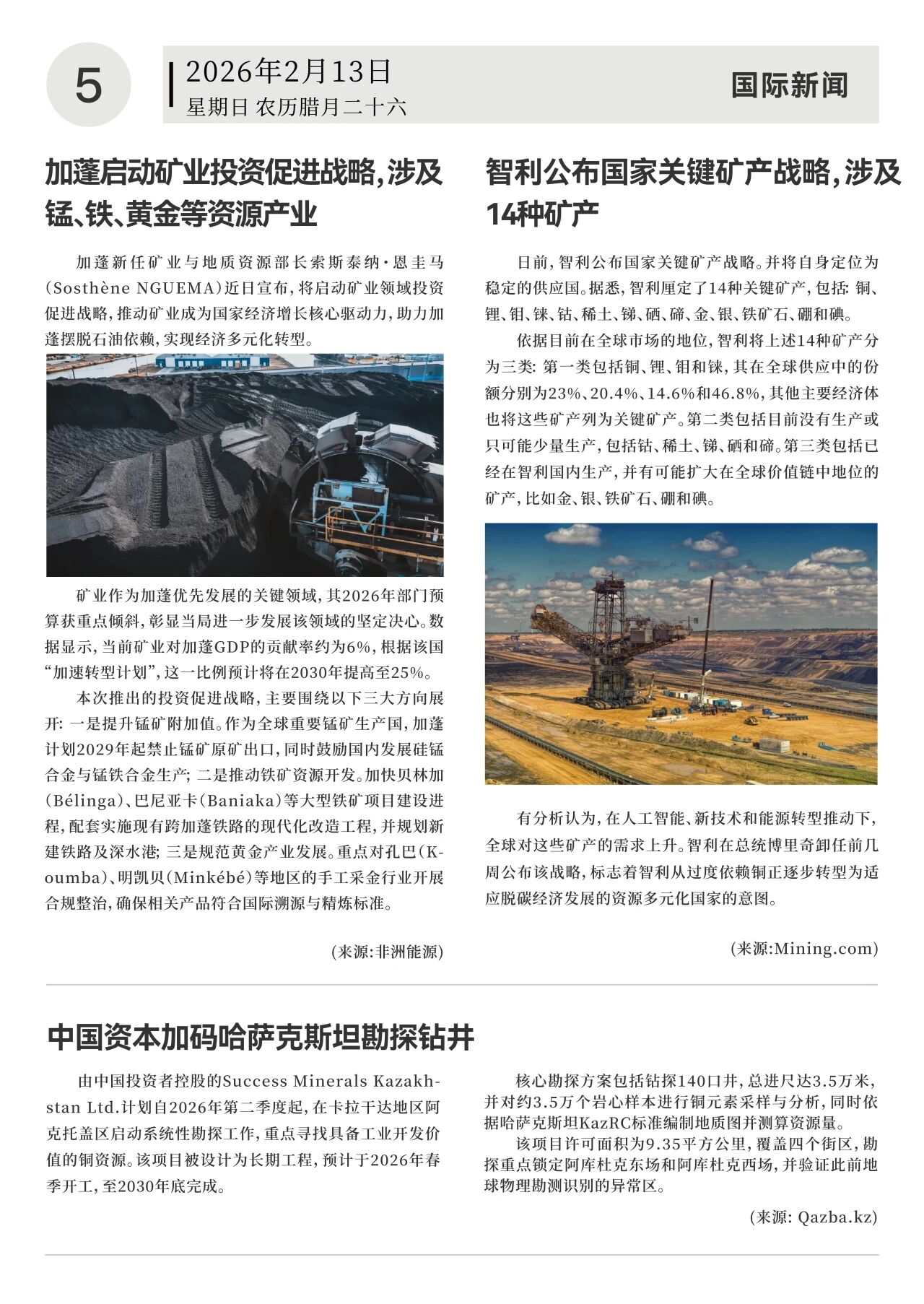 加蓬新任矿业与地质资源部长索斯泰纳・恩圭马近日宣布,将启动矿业领域投资促进战略,主要围绕以下三大方向展开:一是提升锰矿附加值。二是推动铁矿资源开发。三是规范黄金产业发展。数据显示,当前矿业对加蓬GDP的贡献率约为6%,这一比例预计将在2030年提高至25%。