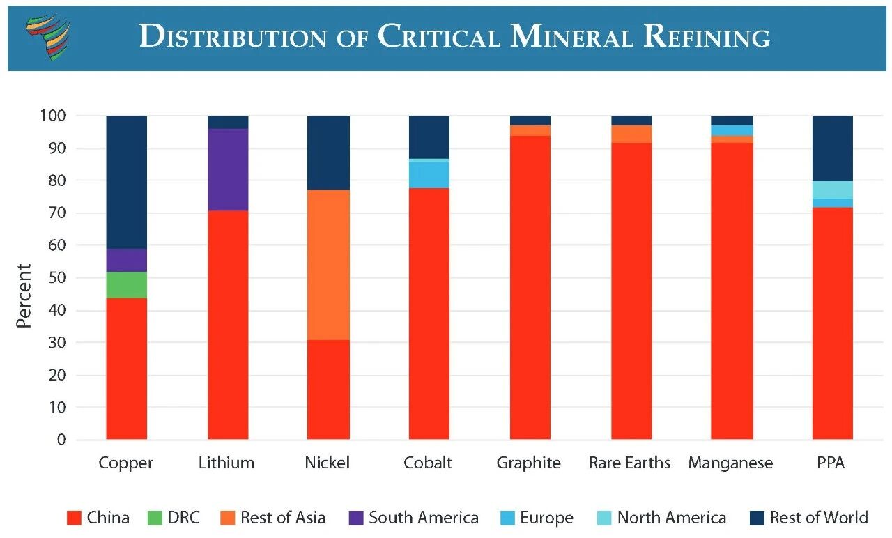 全球对关键矿产——镍、石墨、锰、钴、铜、锂和稀土矿物——的需求正在激增,这些矿产用于国防和航空航天系统、电动汽车、半导体、人工智能及医疗设备。中国目前控制了全球过半的关键矿产产量,并估计控制了约87%的加工和精炼产能。中国还生产了全球近70%的稀土矿物,制造了93%的高强度稀土永磁体,并承担了全球95%的关键矿产深度加工(即从精炼到材料合成的核心工序)。
