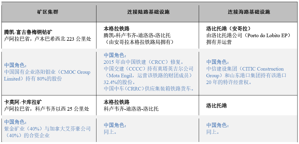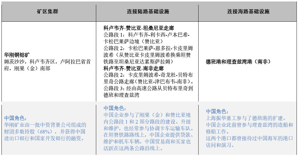 中国企业主导着非洲的基础设施领域,该基础设施网络大部分与采矿相关。赞比亚的100兆瓦奇桑巴(Chisamba)太阳能电站由中国国有能源企业中国电建建造,用于运营的部分由江西铜业持有的第一量子矿业公司。同样,刚果(金)的240兆瓦布桑加(Busanga)水电站为中国国有企业华刚矿业巨大的钴铜综合体供电。