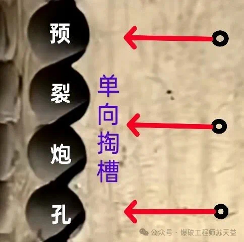 单向掏槽(single-line inclined hole cutting)是一种斜眼掏槽方式,其核心特征是所有掏槽眼均沿同一方向倾斜布置,爆破后形成的槽腔呈半楔状。该技术通过利用岩体的软弱结构面(如层理、节理或软夹层)实现高效破碎,适用于坑道掘进等地下工程场景。掏槽眼与作业面的夹角通常为50°~70°,具体取值取决于岩石硬度:岩石越硬,角度越小。