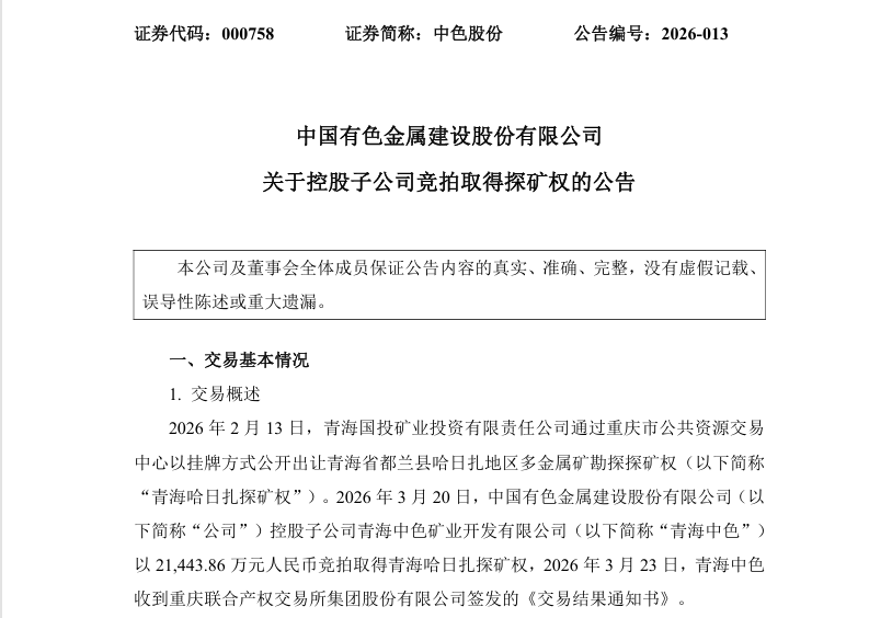 3月23日晚间,中色股份发布重磅公告,公司在有色金属资源布局上再添新动作——控股子公司青海中色矿业开发有限公司,以2.14亿元成功竞得青海省都兰县哈日扎地区多金属矿勘探探矿权,进一步夯实国内资源储备,助力公司“国内增储、海外拓展、存量升级”三维资源战略落地见效。