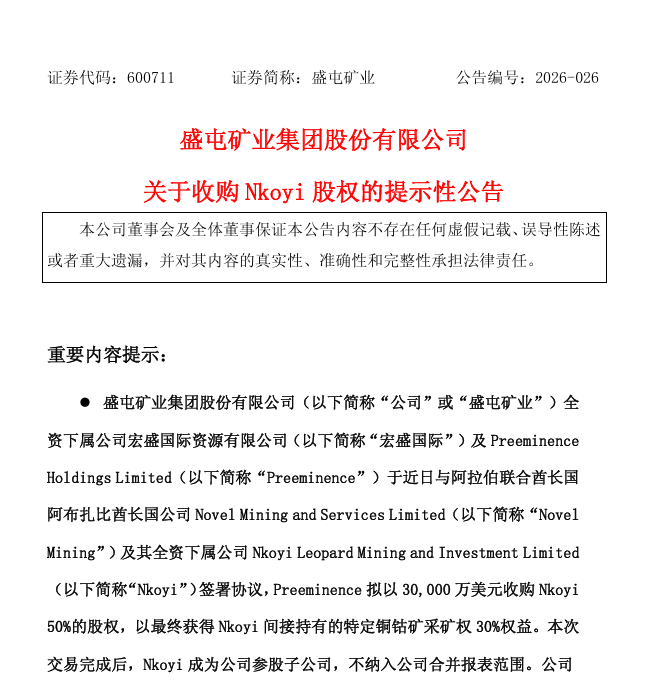 4月7日,盛屯矿业集团股份有限公司发布重磅公告,宣布通过全资下属公司以3 亿美元收购阿联酋企业 Nkoyi 50% 股权,间接拿下刚果(金)世界级铜钴矿60%权益。项目位于刚果(金)中非铜钴矿带核心区域,该矿带横跨刚果(金)与赞比亚,是全球最大、品位最高的铜钴成矿带,钴资源储量占全球超 70%。资源品位:铜平均品位 1.66%、钴平均品位 0.67%,远高于行业平均水平,属于高品位大型矿床。伴生价值:铜钴共生,综合开发价值极高,完美契合新能源电池原材料需求。开发模式:采用现代化露天 / 地下联合开采工艺,配套高效选矿设施,确保资源高效回收。深圳盛屯集团有限公司创建于1993年,依托新能源行业高速发展的时代浪潮,紧抓机遇、趁势而上。集团旗下现拥有盛屯矿业(证券代码:600711)、盛新锂能(证券代码:002240)两家上市公司,以及朗晟新能产业集团、储能、木业等实体产业,业务遍布中国大陆(北京、上海、广东、河北、内蒙古、福建、湖北、四川、云南、贵州等)、中国香港、新加坡、印度尼西亚、刚果(金)、津巴布韦、赞比亚、尼日利亚、南非、阿根廷等多地,初步实现了立足中国、走向世界的产业格局,并在进一步高质量拓展全球业务领域。主营业务:聚焦铜、钴、镍、锌、黄金等能源金属与贵金属的勘探、开采、冶炼。全球布局:形成中国、印尼、刚果(金) 三大核心基地,是国内少数具备海外大规模矿山开发运营能力的民营企业。