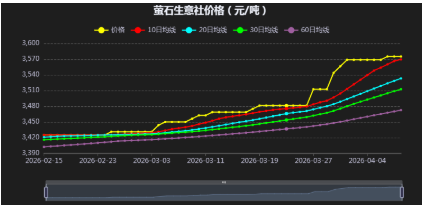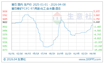 4月以来国内萤石价格走势小幅上涨,截止8日国内萤石均价为3575元/吨,较月初价格3568.75元/吨上涨0.18%,同比下滑4.98%。