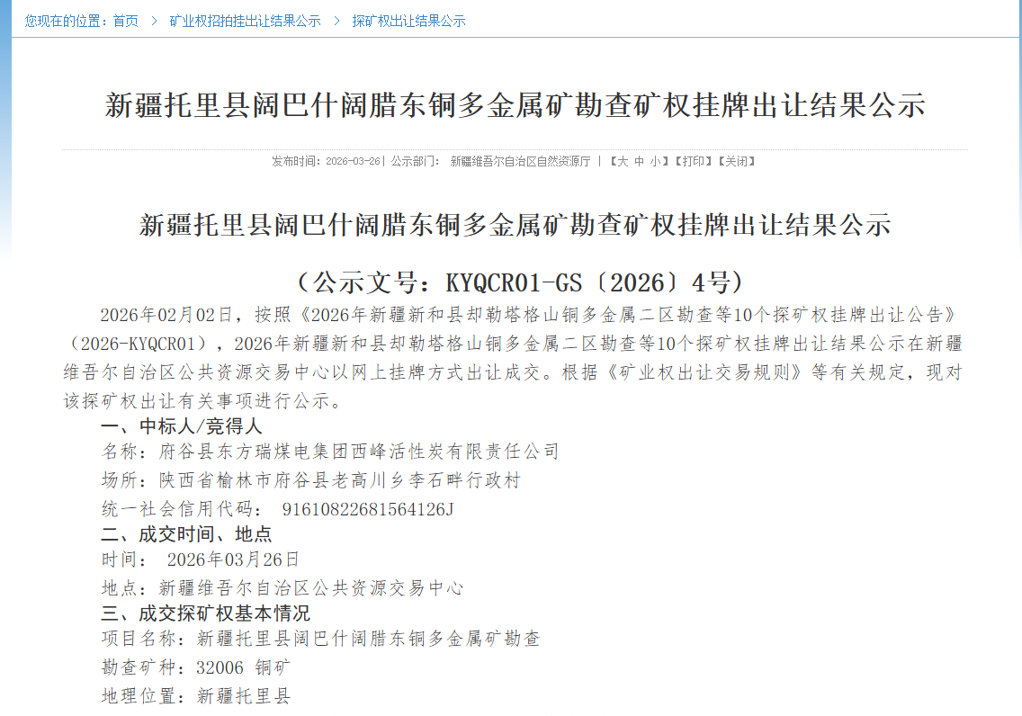 新疆自然资源厅最新公示:新疆托里县阔巴什阔腊东铜多金属矿探矿权成功出让!该探矿权起始价仅29.76 万元,最终以10105.76 万元成交,溢价率高达33852%,创下近期新疆矿业权出让市场的亮眼纪录。竞得方为府谷县东方瑞煤电集团西峰活性炭有限责任公司,标志着陕西能源化工巨头正式进军新疆战略性矿产资源领域。