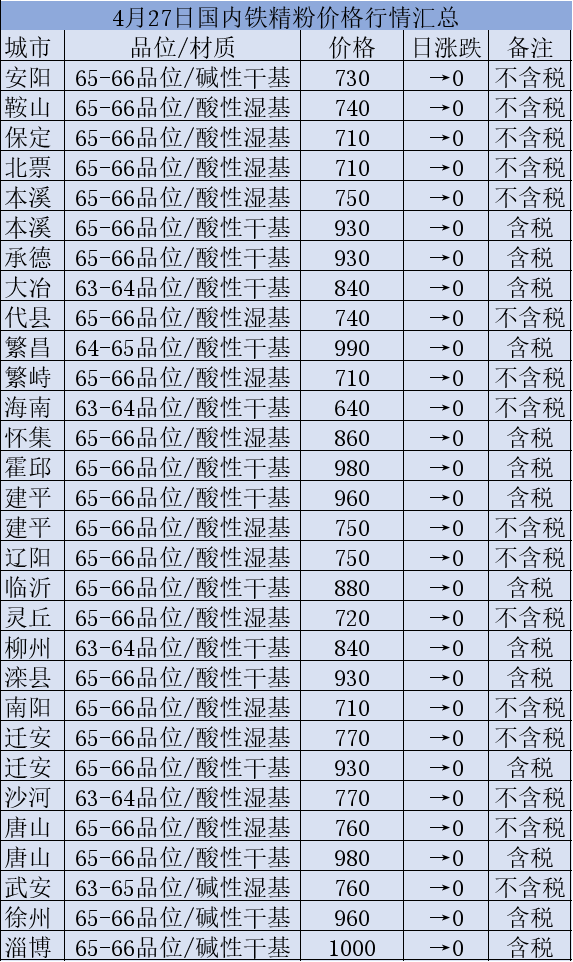 4月27日国内铁精粉行情汇总