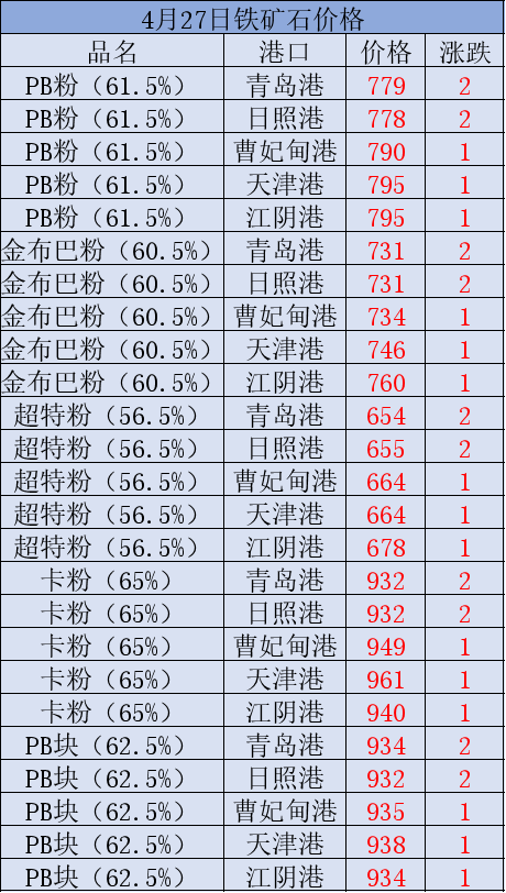 4月27日矿石价格汇总