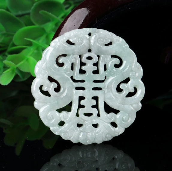 天然翡翠吊坠双面镂空雕刻挂坠-双龙捧寿镂空牌